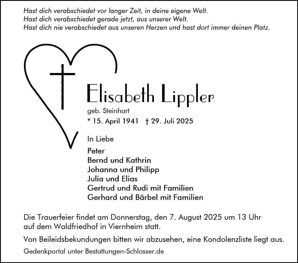 Lieber Herr Lippler und Familie, wir möchten Ihnen von Herzen unser tiefes Mitgefühl und Beileid zu Ihrem schweren Verlust bekunden. Mögen Sie viel Kraft und Trost in dieser schweren Zeit der Trauer füreinander haben, aber auch die Hoffnung auf eine Zeit der dankbaren Erinnerung an einen geliebten Menschen. In aufrichtiger Anteilnahme Familie Volker Friderich.