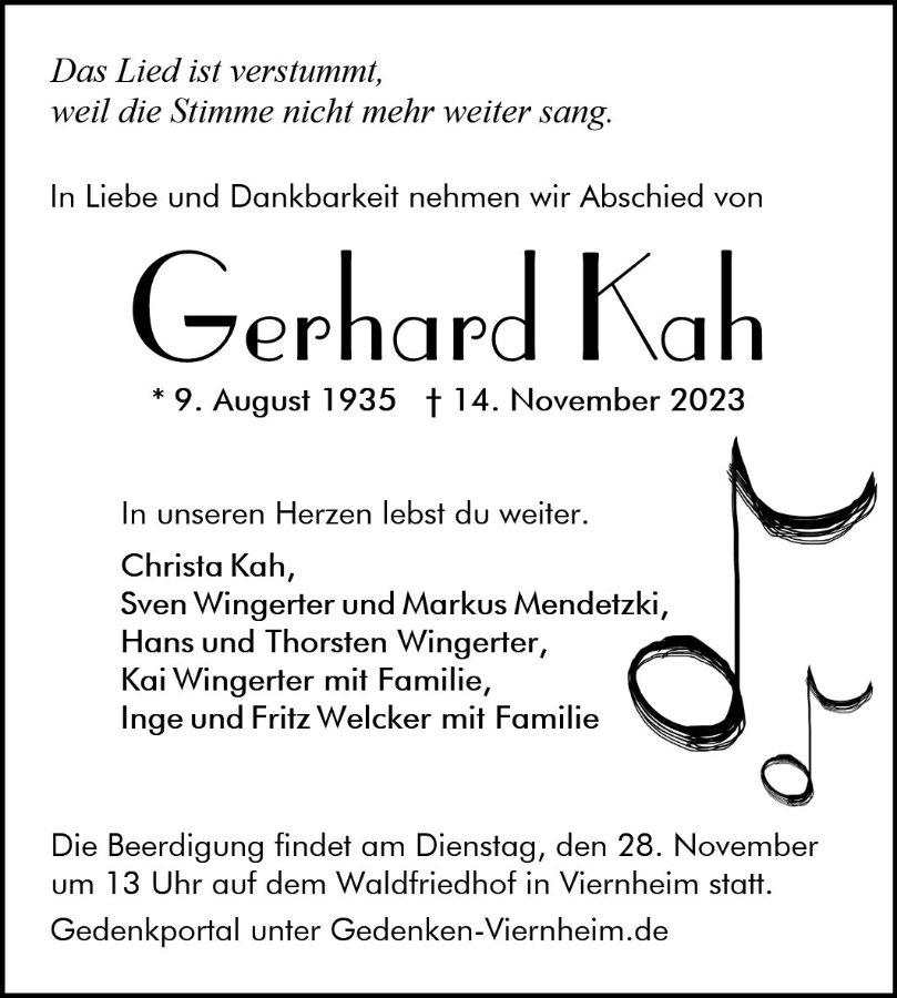mein herzliches Beileid zum Tode von Gerhard. Mit Ihm verliert nicht nur die Sänger-Gemeinschaft ein engagiertes Mitglied auch die Mannheimer Neckarstadt verliert einen langjährigen und engagierten Wegbegleiter und Freund. Als Mitglied und früherer Vorstand des ehemaligen Bürgerverein Neckarstadt habe ich Gerhard Kah immer als aufrichtigen Freund und Mitstreiter erlebt und gerne mit ihm zusammengearbeitet. Auch wenn in den letzten Jahren der Kontakt verloren gegangen ist, so hat mich sein Tod doch tief bewegt und ich werde mich immer gern an ihn erinnern. Ich bin mir sicher, von wo auch immer wird er immer auch auf seine Neckarstadt blicken.