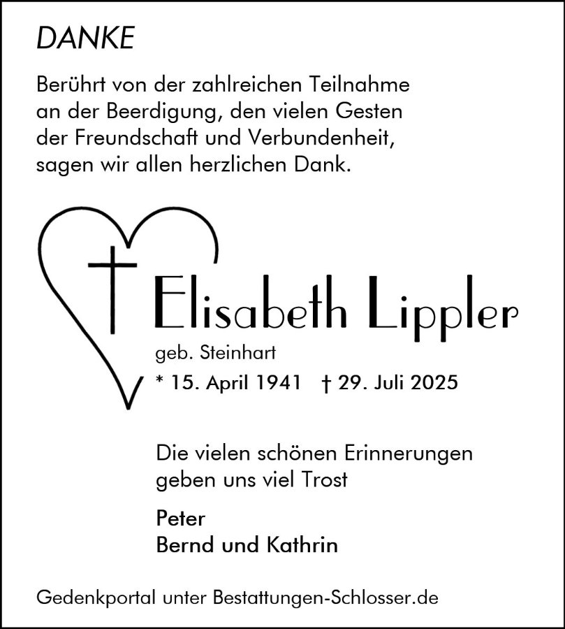 Lieber Herr Lippler und Familie, wir möchten Ihnen von Herzen unser tiefes Mitgefühl und Beileid zu Ihrem schweren Verlust bekunden. Mögen Sie viel Kraft und Trost in dieser schweren Zeit der Trauer füreinander haben, aber auch die Hoffnung auf eine Zeit der dankbaren Erinnerung an einen geliebten Menschen. In aufrichtiger Anteilnahme Familie Volker Friderich.