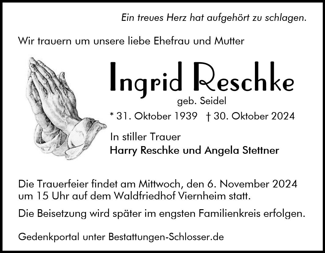 Herr Reschke und Angela Stettner Herzliche Anteilnahme Erinnerungen gehen niemals Verloren . Roswitha Canales